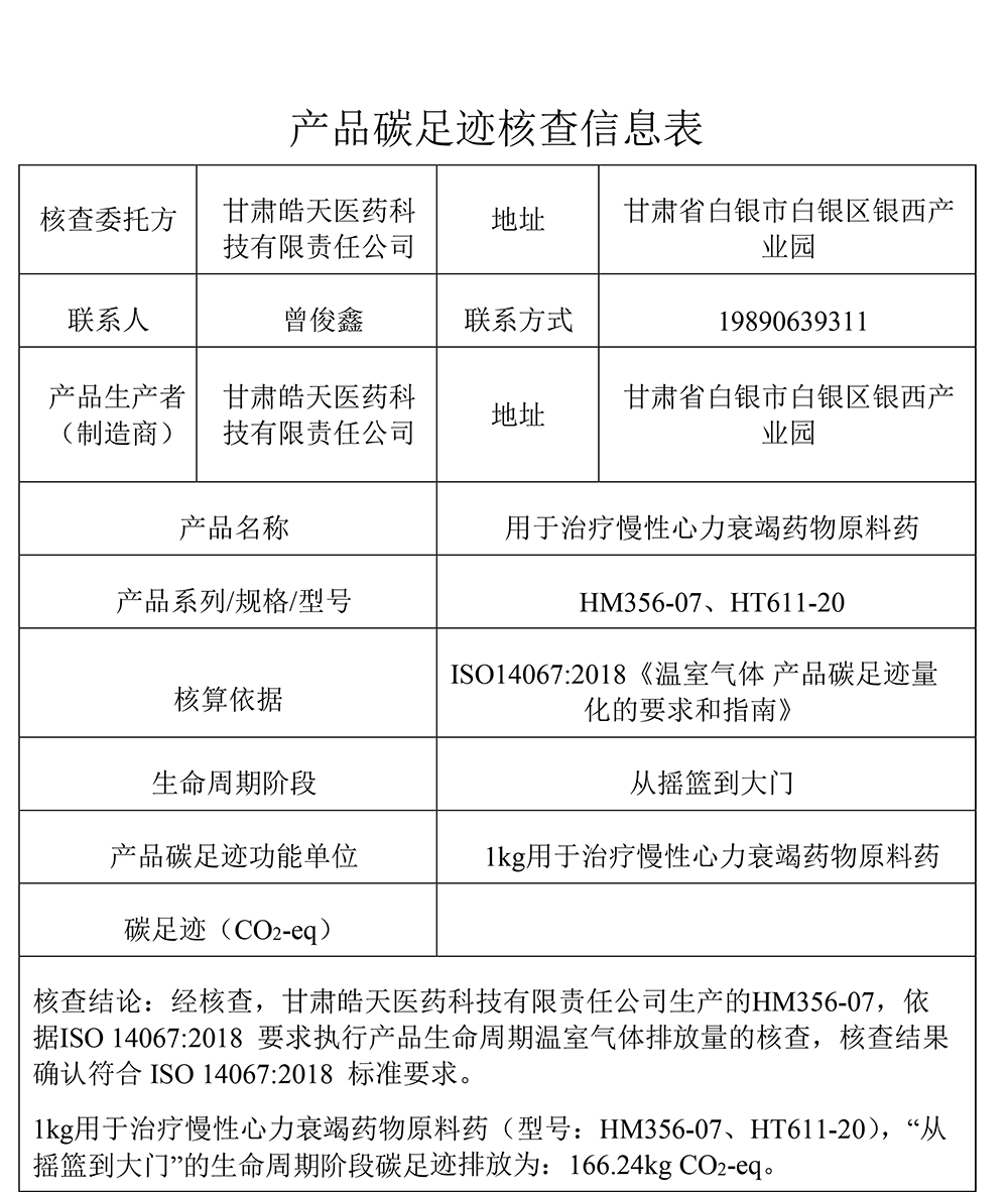 碳足跡核查報告--甘肅皓天醫(yī)藥科技有限責(zé)任公司
